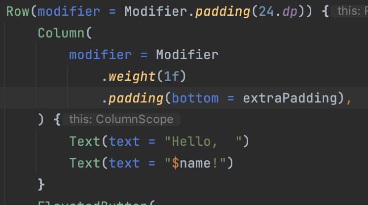 Hello 와 name Text 를 새로로 배치하기위해 Column block 안에 순서대로 배치했다. 버튼과 텍스트는 반대로 가로로 배치해야하므로 Row 함수 블럭 안에 Column 과 ElevtedButton 을 추가했다.