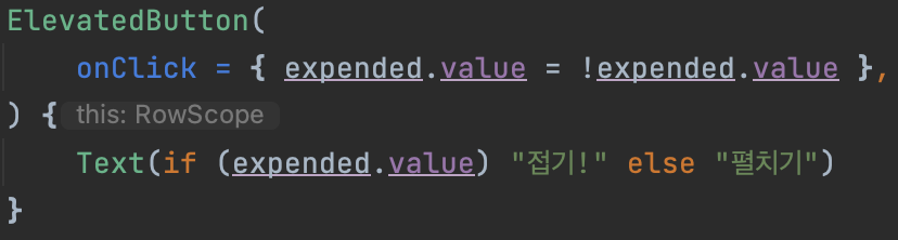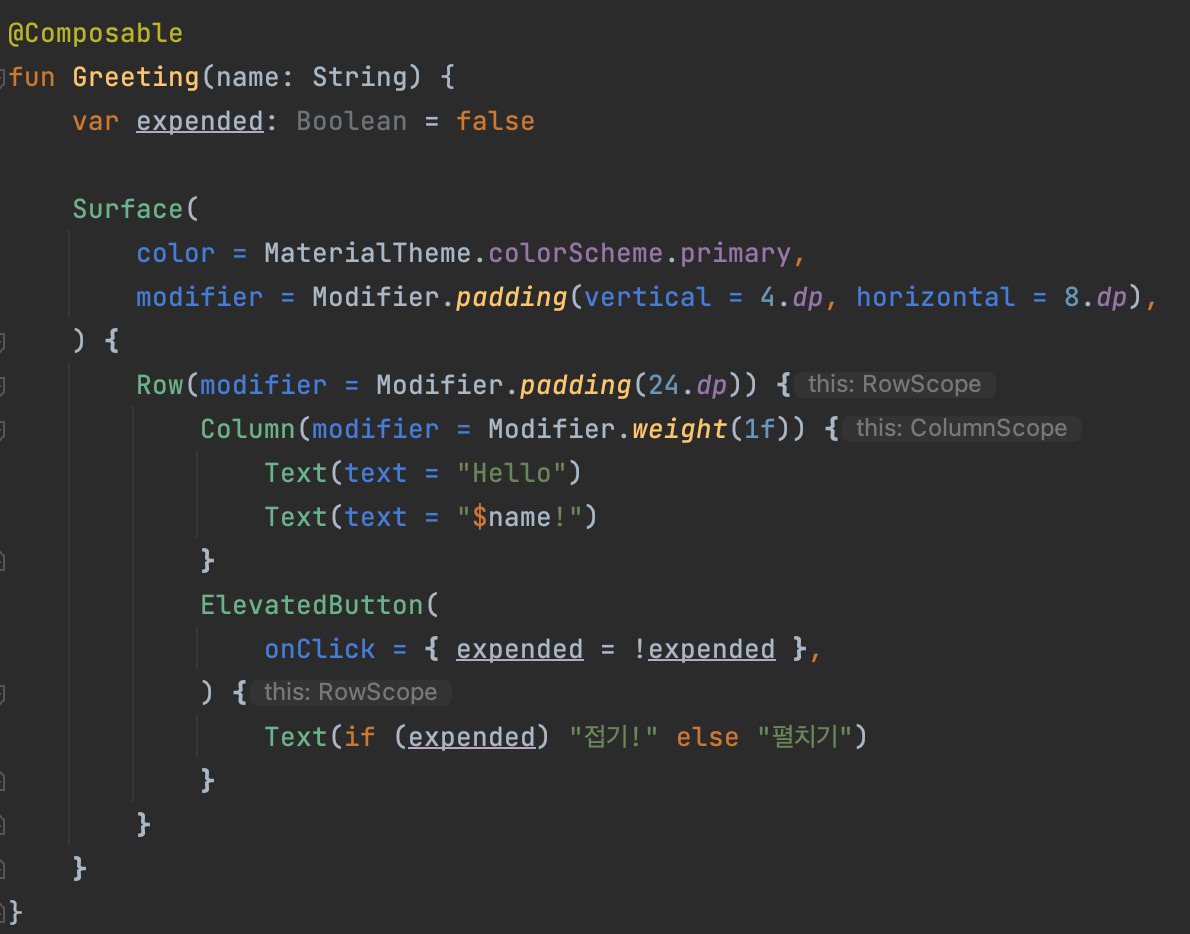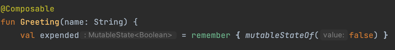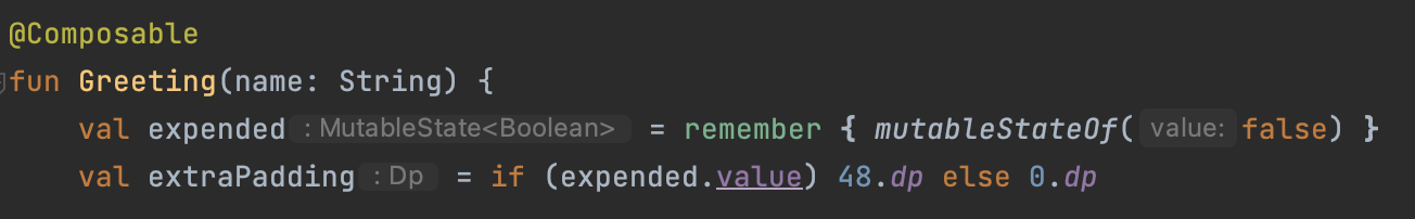 위에서 expended 변수가 변경되었을 때 리컴포지션 이 트리거되지 않는 이유는 이 변수를 컴포즈에서 추적하지 않기 때문이다. 또한 Greeting 이 호출될 때마다 false 로 초기화된다.