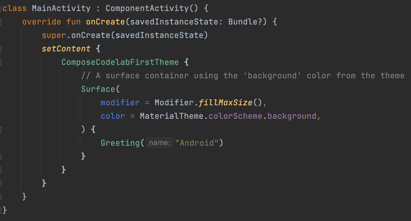 - Theme : 패키지 이름과 동일하게 만들어져있는 ComposeCodelabFirstTheme 함수가 있는데 이는 컴포저블 함수의 스타일을 지정하는 방법이다.