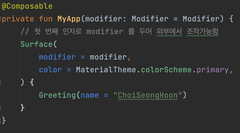 함수는 기본적으로 빈 modifier 가 할당되는 modifier 매개변수를 포함하는 것이 좋다. 매개변수로 modifier 를 전달해 외부에서 레이아웃 웃을 조작할 수 있게 만든다.