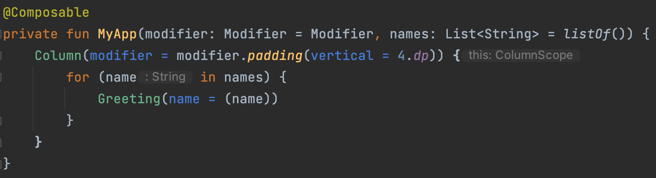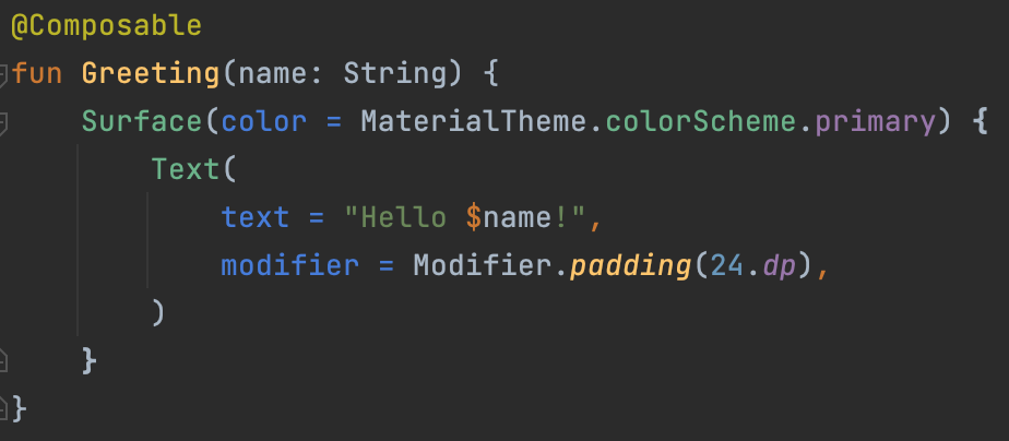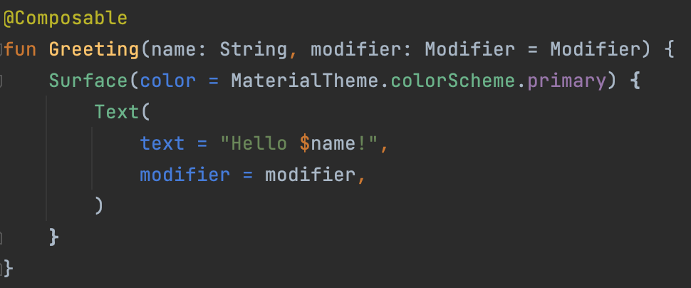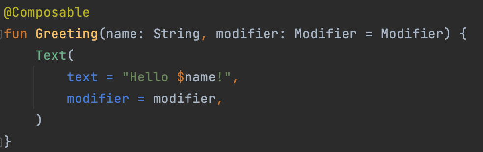 Text 는 라이브러리에서 제공하는 컴포저블 함수이다. 이 함수를 내부에서 호출한 Greeting 은 컴포저블 어노테이션이 붙은 컴포저블 함수인 것이다. Greeting 함수는 name 문자열을 출력한다.