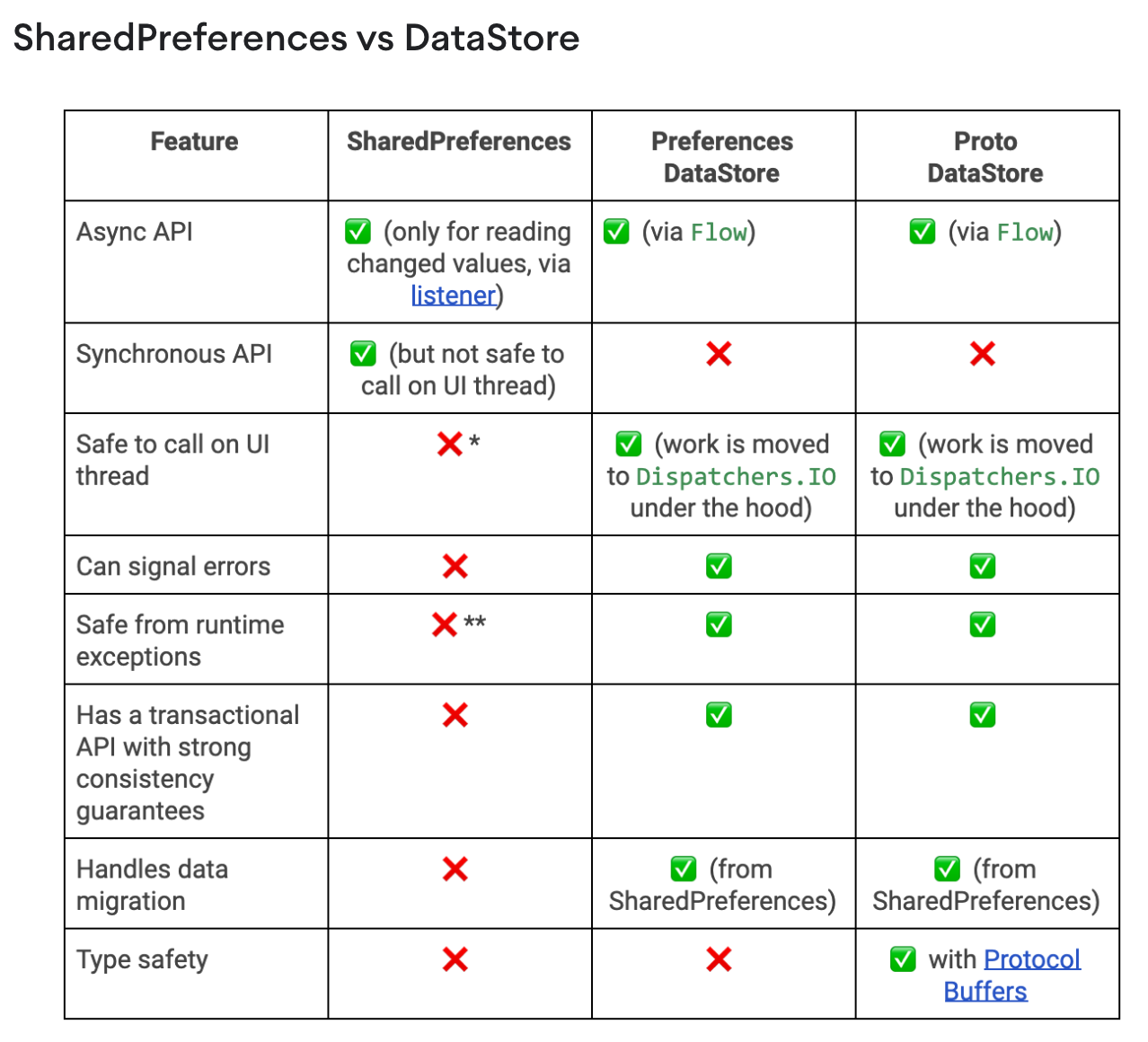 요약하자면 SharedPreferences는 UI 스레드에서 호출하기에 안전해 보일 수 있는 동기 API가 있고, 오류 신호를 보내는 메커니즘이 없으며 트랜잭션 API가 없다. 거의 모든 단점을 DataStore 는 해결하며 대체한다. Datastore는 Kotlin 코루틴과 Flow를 사용하는 완전 비동기 API가 있으며, 데이터 이전을 처리하고, 데이터 일관성을 보장하고, 데이터 손상을 처리한다.