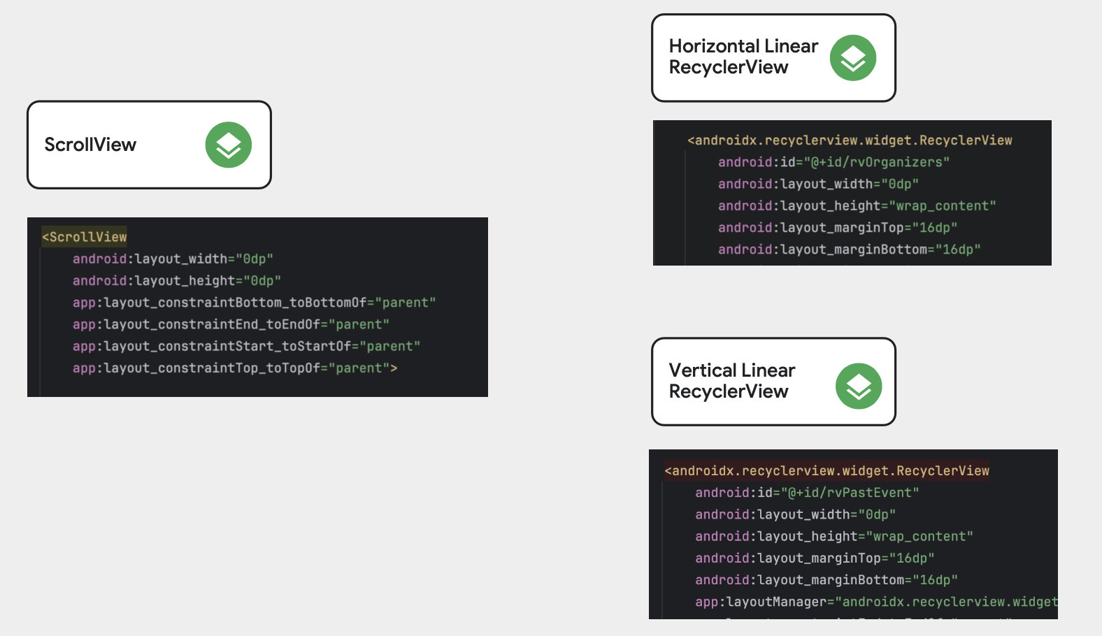 그렇다면 우린 이것들 중 무엇을 사용해야할까요? 재사용할 수 없는 NestedScrollView 는 쓰면 안되는걸까요? 이것 또한 정답은 없습니다. 당장 빨리 릴리즈 해야하는데 성능이 중요하지 않을 수도 있습니다. 혹은 아이템 개수가 작아서 재사용이 필요없을 수도 있고요. 구현 방법을 이해하고 장단점을 숙지하고 있다가 본인의 상황에 맞춰서 사용하길 바랍니다.