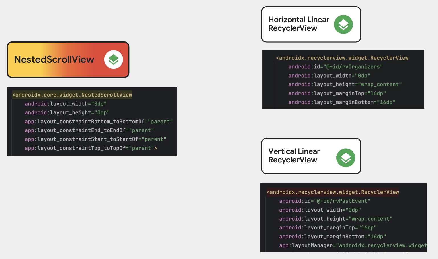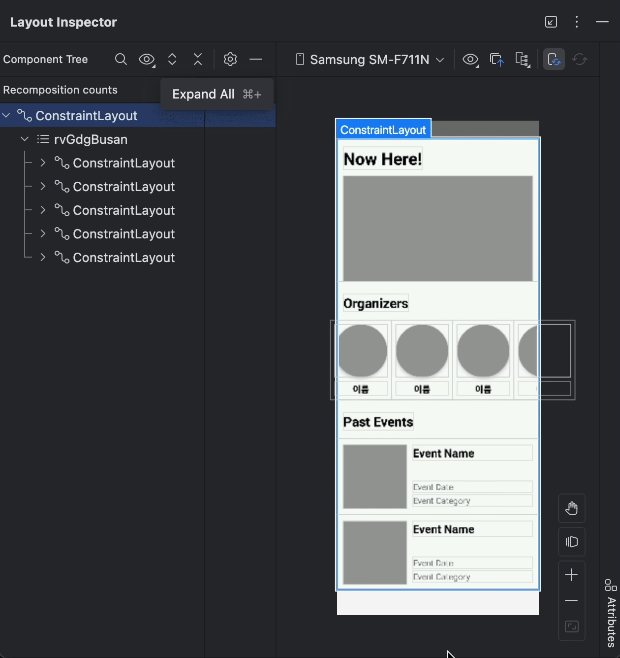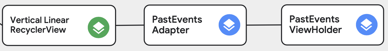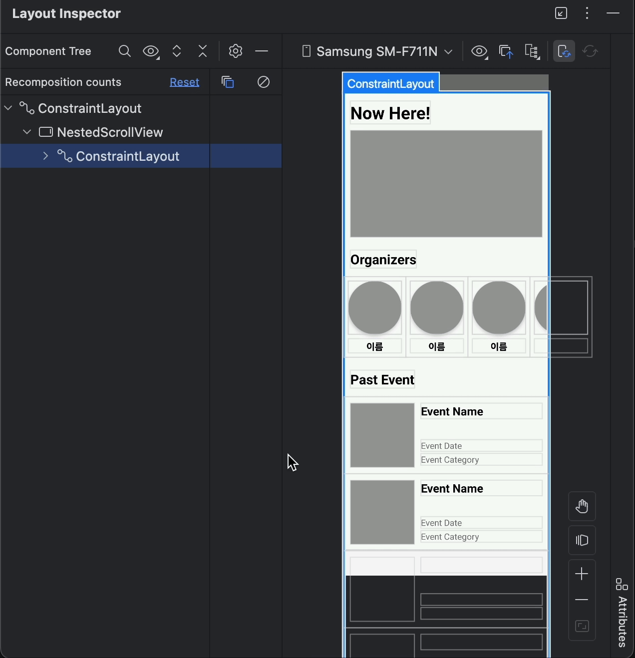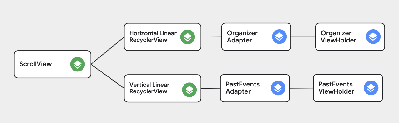 AndroidStudio 의 Layout Inspector 를 확인해보면 문제점을 발견할 수 있습니다. 스크롤 방향이 다른 vertical RecyclerView 는 재사용이 잘 되지만 방향이 겹친 Past Event 는 뷰가 재사용되지 않고 미리 다 그려버리는 것을 확인할 수 있습니다. NestedScrollView 는 매우 간단하지만 리사이클러뷰의 가장 큰 장점을 없애 버리죠. WrapContent 높이를 사용하면, 모든 자식 View들이 한 번에 Measure & Layout 되어야 합니다.