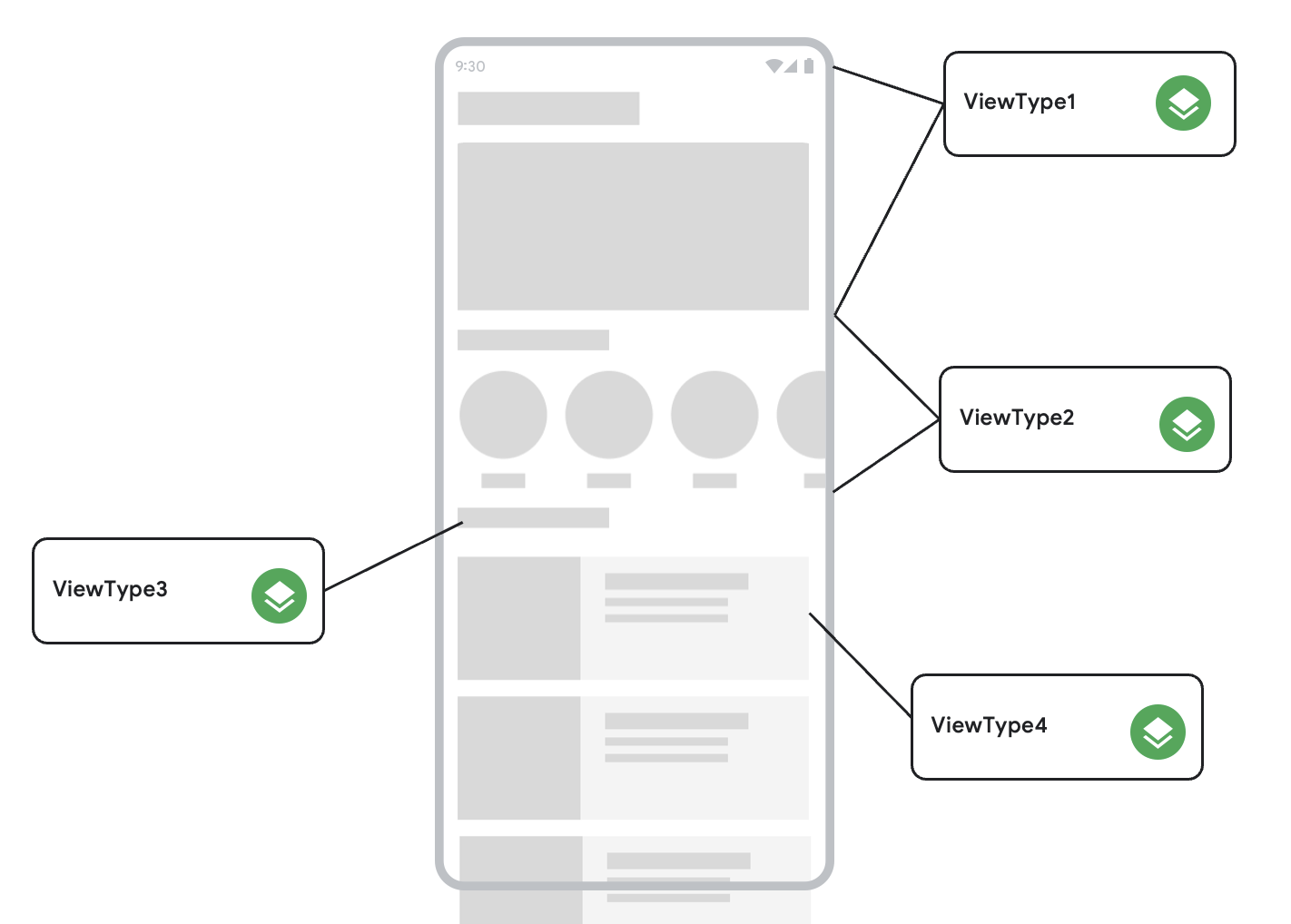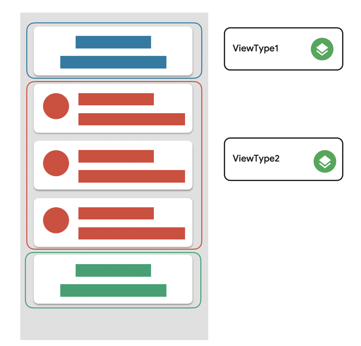 그럼 재사용 가능하게 만드는 방법은 없을까요? 앞에서 소개한 Multi-ViewType 방식을 사용해 봅시다. RecyclerView 는 ViewType 에 따라 다른 ViewHolder 를 사용하도록 할 수 있습니다. 이를 이용하면 ViewHolder 안에 RecyclerView 를 넣을 수도 있죠.