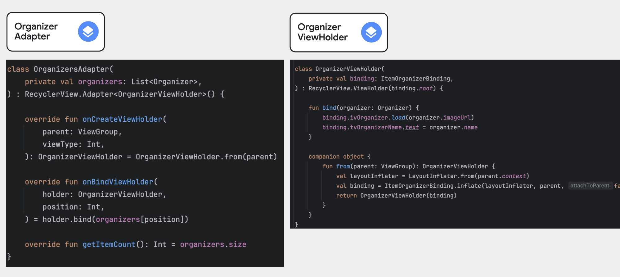 기본 구현 방식은 다음과 같습니다. RecyclerView.ViewHolder 를 상속하는 ViewHolder 를 구현하고 Adapter 에 해당 ViewHolder 타입을 전달합니다. 그 후 RecyclerView 의 adapter 로 set 하면 됩니다.