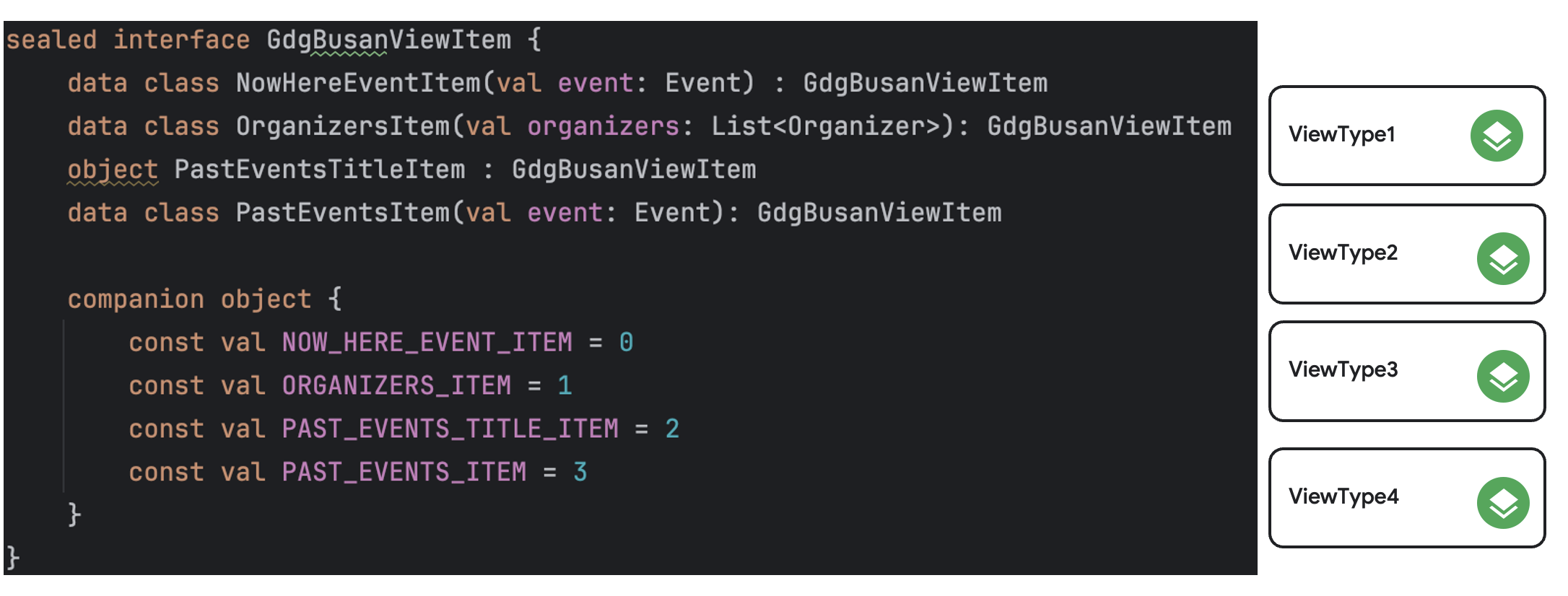 각 아이템 형태에 따라 필요한 데이터 형태의 Sealed interface 를 GdgBusanViewItem 이름으로 정의하였습니다. GdgBusanRecyclerView 는 4가지 뷰타입을 재사용하며 화면에 그리고 그 중 OrganizersViewHolder 는 그 내부에 RecyclerView 를 그립니다.