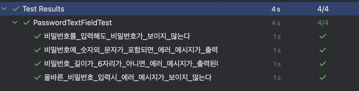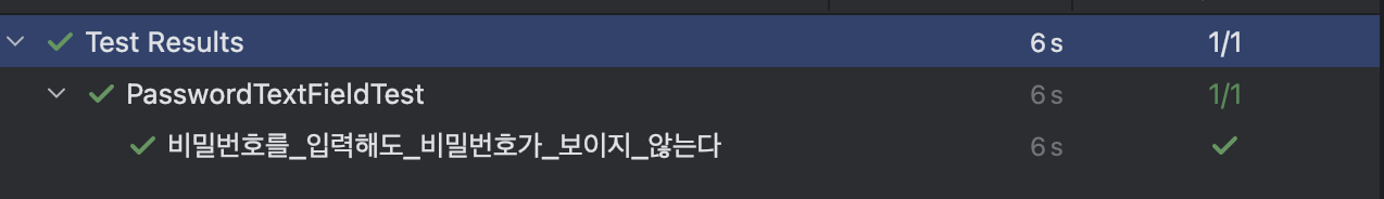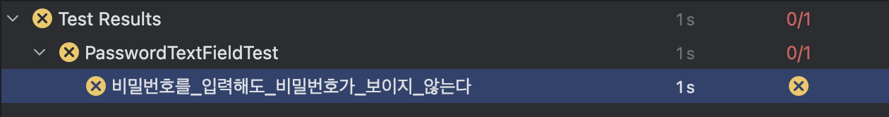 테스트를 실행해보면 바로... 실패! PasswordTextField 에 비밀번호 입력이 보이지 않도록하는 코드를 않았기 때문이죠.